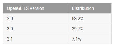 Finalmente en cuanto a las versiones de OpenGL, la versión 2.0 es la ganadora con 53.2%, de segudo está OpenGL 3.0 con un 39.7% y de tercero, OpenGL 3.1 con un 7.1%.