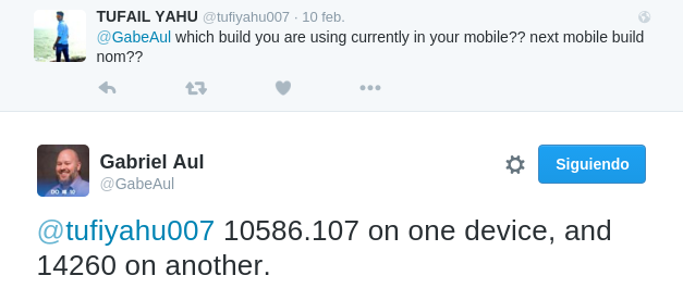 ¿Cuál build estas usando actualmente en tu móvil?, ¿próxima numeración de la build móvil? esta fue la pregunta formulada por un usuario a Gabe Aul vía Twitter a lo que él (Aul) respondió: «10586.107 en un dispositivo, y 14260 en otro»