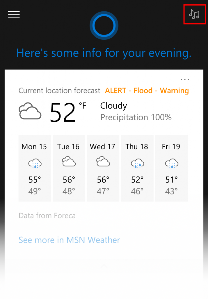 - Se incluye un nuevo botón en la parte superior derecha que facilitará la búsqueda de música en Cortana