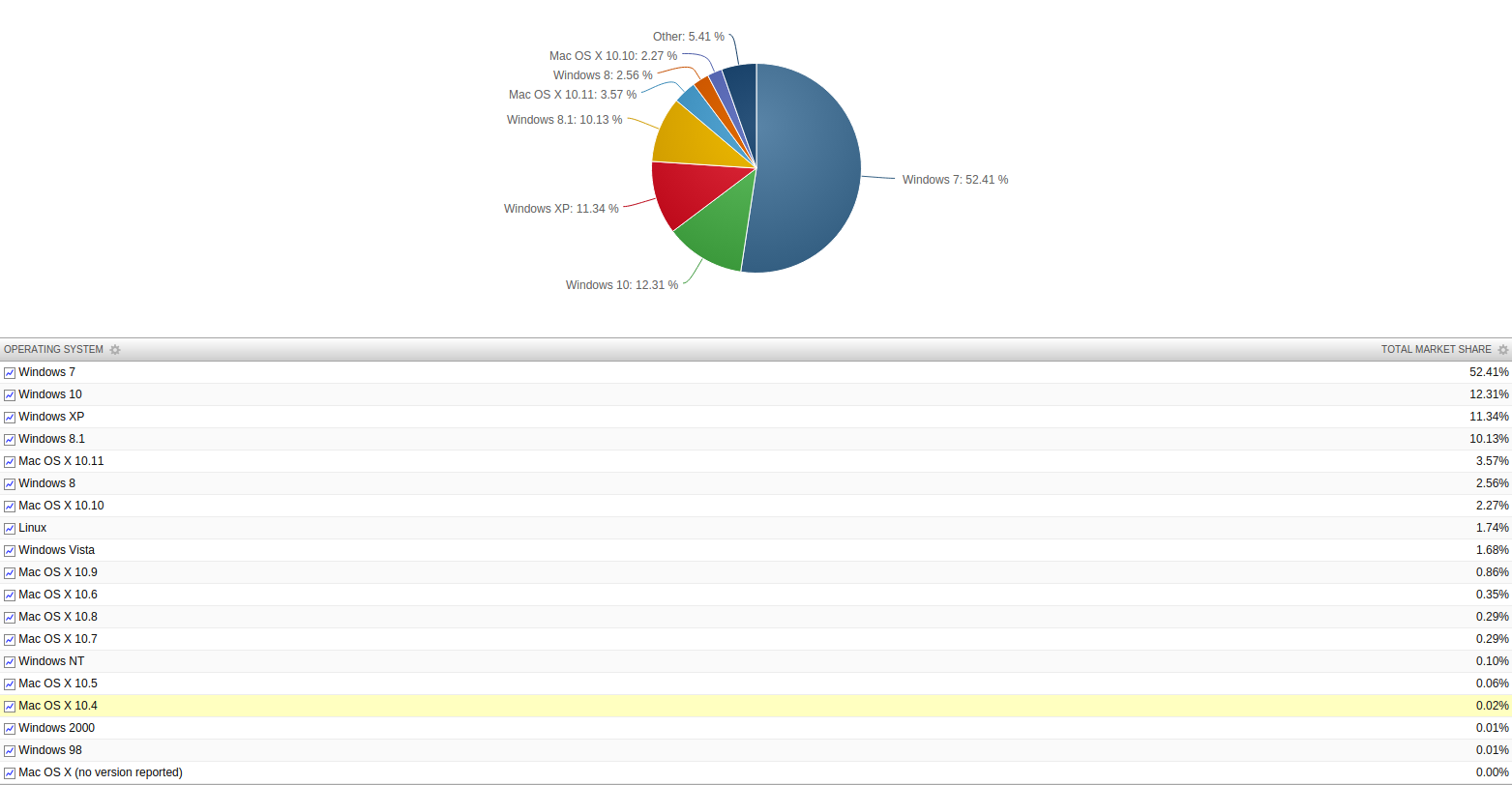De acuerdo con la gente de Net Applications, Windows 7 tiene un 52.41% de mercado seguido de Windows 10 con un 12.31% en lo que va del 2016.
