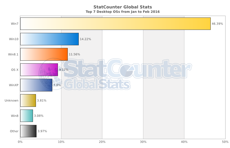 Por su parte la gente de StatCounter reporta que Windows 7 tiene un 46,39% mientras que Windows 10 tiene un 14,22% en lo que va del 2016.
